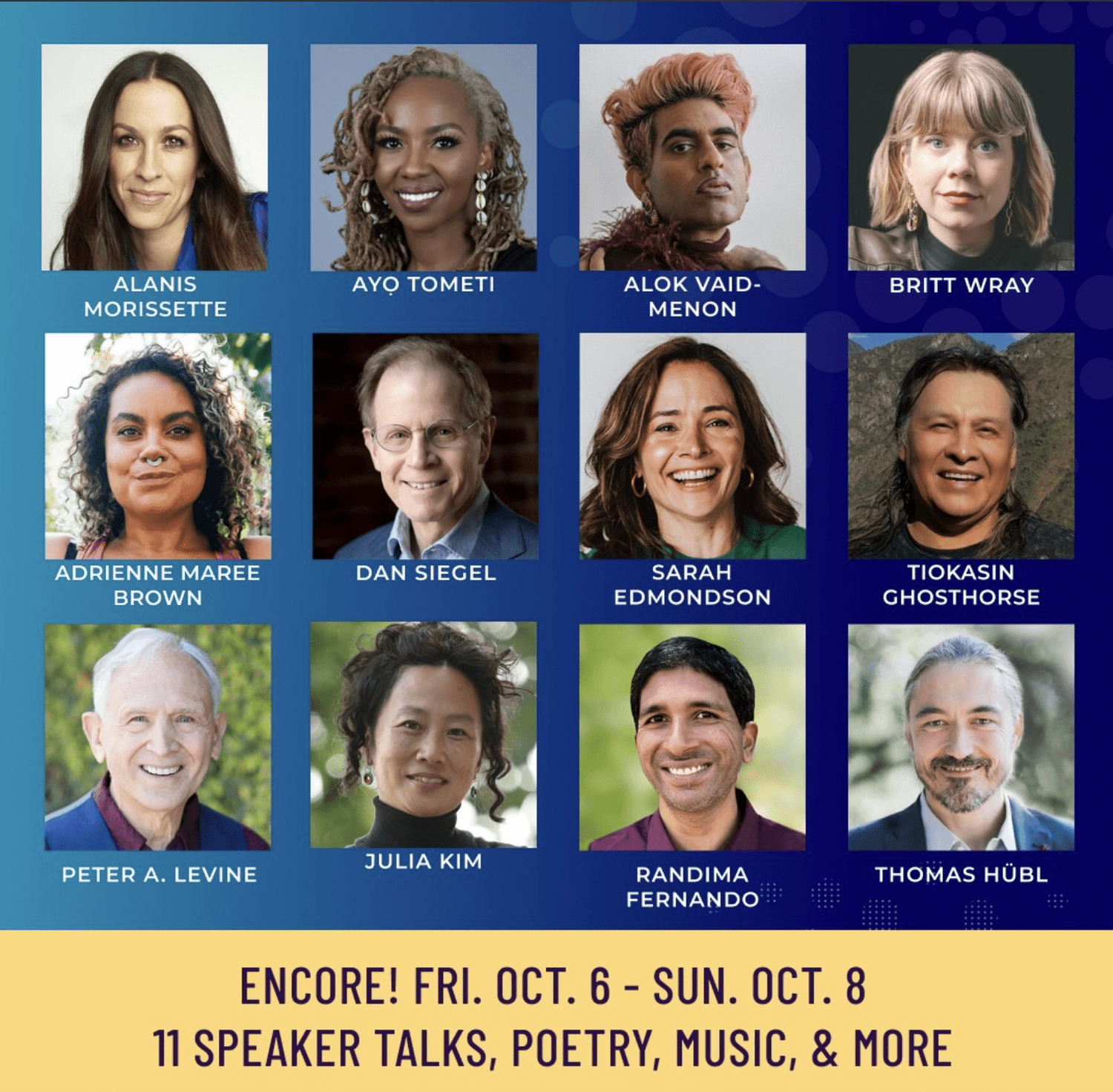 Additional Encore speakers include Dr. Dan Siegel, Alanis Morissette, adrienne maree brown, Alok, Ayọ Tometi, Britt Wray, Tiokasin Ghosthorse, Sarah Edmondson, Dr. Julia Kim, and Randima Fernando.