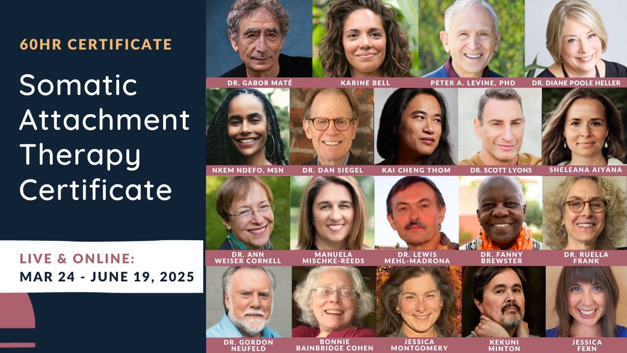 The Embody Lab is bringing together the world’s most renowned Somatic Attachment Therapy teachers into one Certificate Program, such as Dr. Gabor Maté, Dr. Dan Siegel, Dr. Scott Lyons, Dr. Diane Poole Heller, Bonnie Bainbridge Cohen, and many more.